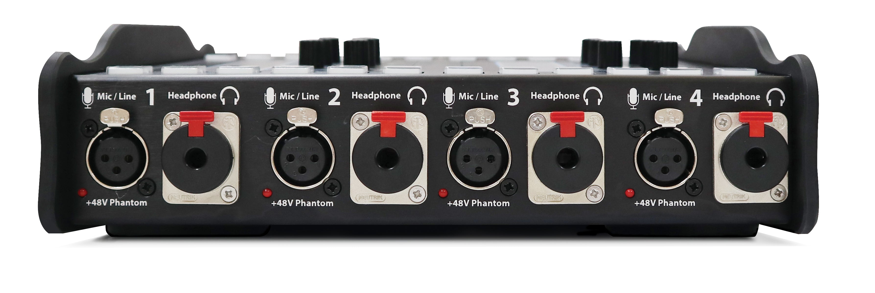 • Four locking mic/line inputs with phantom power and adjustable gain