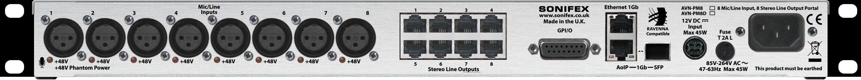 The Sonifex AVN‑PM8 8 Mic/Line Inputs, 8 Line Outputs, Terminal Block, AES67 Portal is a professional audio mix engine and network interface designed for flexible routing, mixing, and distribution in RAVENNA/AES67 audio-over-IP environments. It offers eight balanced XLR mic/line inputs with adjustable gain and +48 V phantom power for each channel, plus eight balanced stereo line outputs accessible via D-Sub and StudioHub®-pinout RJ45 connectors, making it ideal for broadcast, live production, and installation workflows.