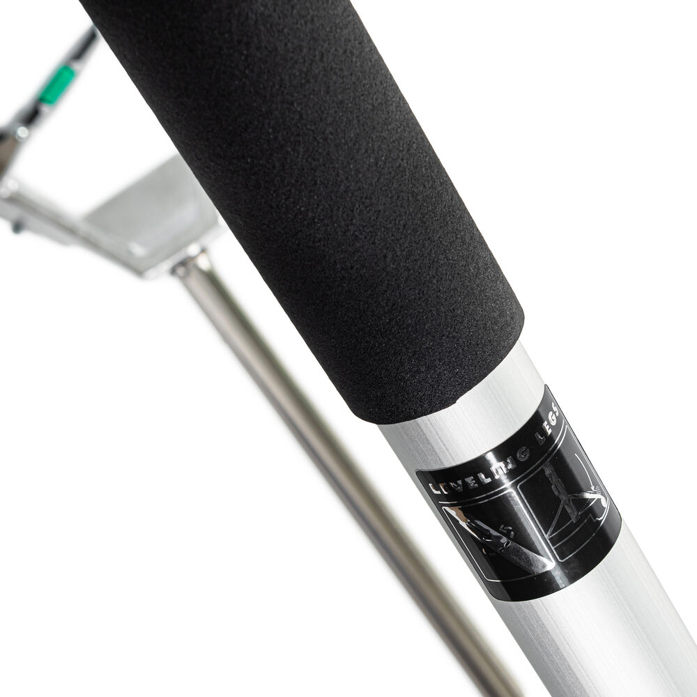 The Long John Silver stand uses a powerful crank-operated winch system to lift some of the largest lights for demanding cinematic and commercial productions. At its maximum height of 224", the stand can support fixtures up to 264 lb, withstanding the massive weight of high-output HMIs or heavy-duty LED panels, perfect for simulating natural sun or moonlight. The gas-assisted winch mechanism raises lights at a quick pace while a safety clutch provides peace of mind while derigging lights. Each of the stand's three legs can be individually leveled to ensure proper weight distribution on inclined surfaces, and a built-in bubble level confirms these settings.