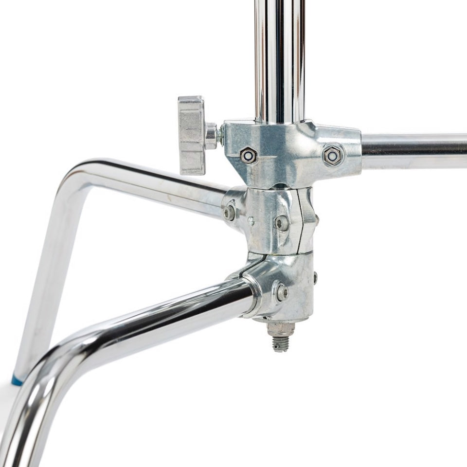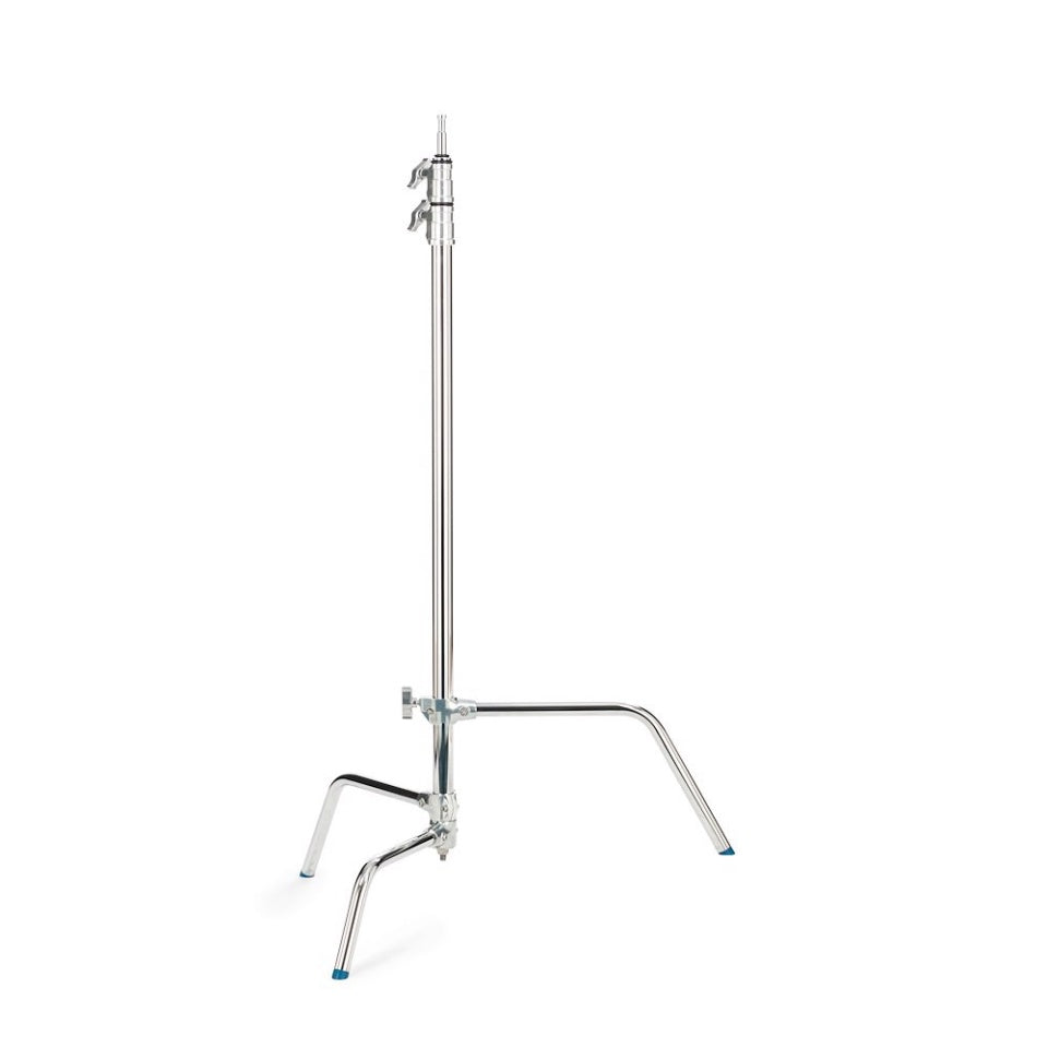 This 10.75' Avenger Sliding Leg C-Stand features chrome-plated steel construction and a 3-section column with 2 risers. The innovative design of the base allows the individual legs to be set at any angle allowing positioning in locations not possible with classic stands. One of the legs slides along the center column to accommodate uneven terrain. The legs fold flat for easy storage.