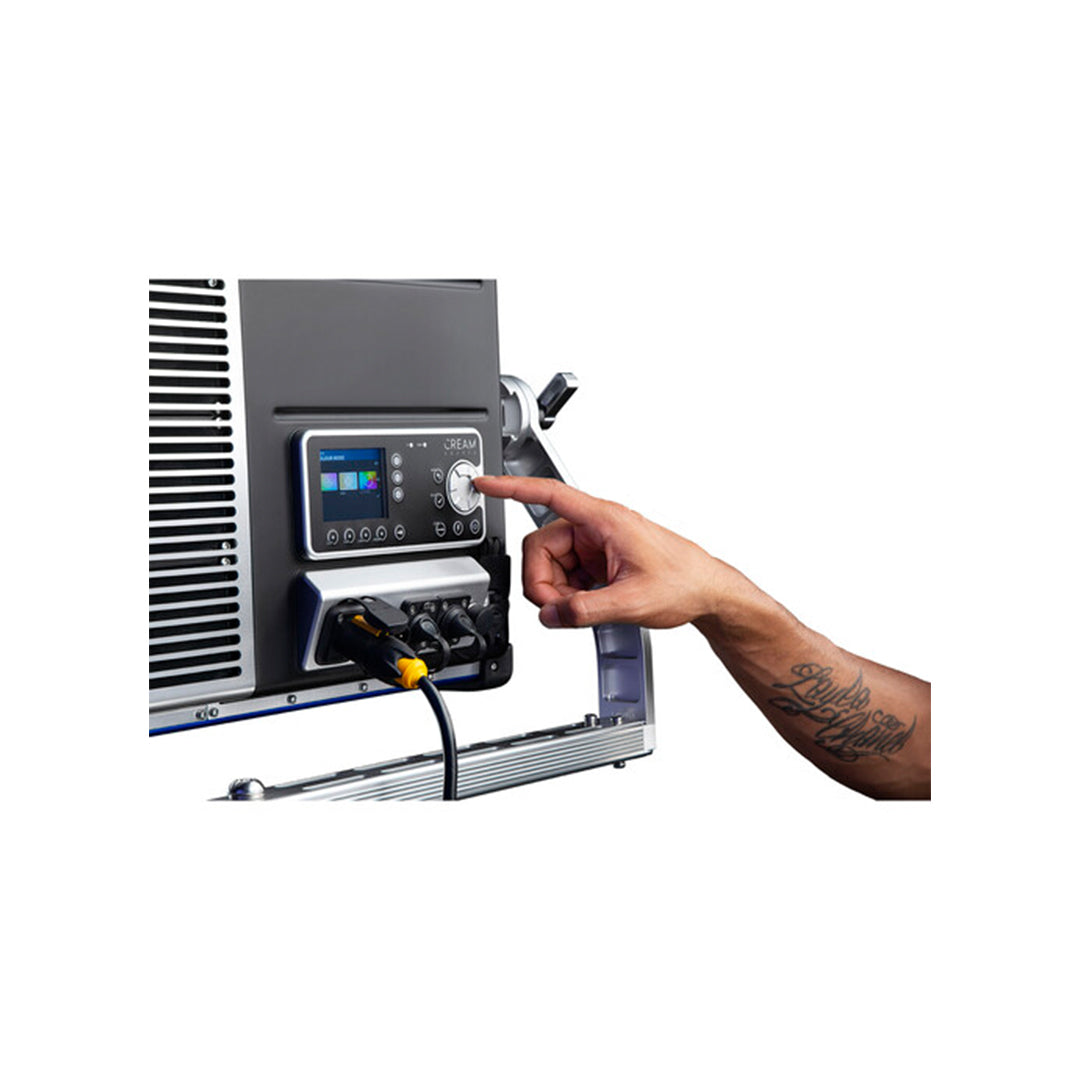 In addition to the integrated button, LED display, and dial controls on the back, connectivity options include 5-pin DMX input and output, an included wired remote, a Creamsource Accessory port, integrated LumenRadio Timo Two antennas with Bluetooth, Ethernet, and a USB Type-A port. The light can also be synced with slow-motion cameras to match their frame rate in high speeds up to 5000 fps.