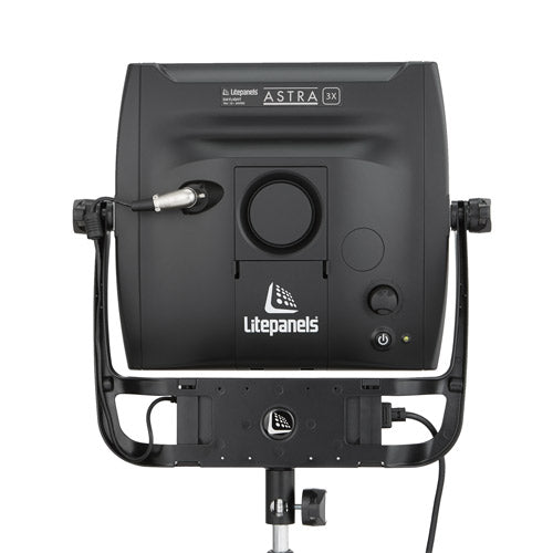 Astra 3X Daylight comes with both US and EU power cables and a universal (100-240 VAC) yoke-mounted power supply. If AC power is unavailable, or you want maximum setup speed and flexibility, Astra panels run on 13-24V DC batteries with an optional Gold Mount or V-Mount battery plate. Battery power is supplied via a durable XLR3 locking power connector for reliability in any environment.