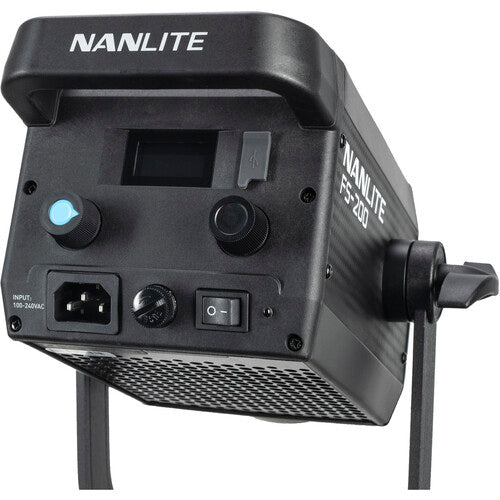 Adopting a popular, easy-to-use form factor, the FS-200 LED Daylight AC Monolight from Nanlite has a daylight color temperature of 5600K with a high CRI/TLCI of 96/98 indicating advanced accuracy in color rendition. The 12 x 9.1 x 4.8" fixture weighs 5.5 lb making it a welcome addition to your kit, while its 55° reflector allows it to output 29380 lumens. The Bowens-type reflector mount is not only compatibile with Nanlite accessories, but with those of the many manufactures who use this popular mount A bonus is the FS-200's 11 special effects including INT Loop, Flash, Pulse, Storm, TV, Paparazzi, Candle/Fire, Bad Bulb, Fireworks, Explosion, and Welding.The FS-200 is cooled by a quiet fan and dimmable from 0 to 100%. The light is ready for worldwide use thanks to its 110 to 240 VAC power supply.