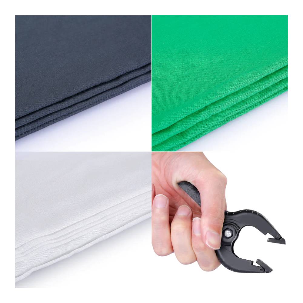 Included in the package are three backdrop sheets measuring 1.8 meters by 2.8 meters in white, black, and green. These backdrops are perfect for television, video production, and digital photography. Each sheet has A-rod pockets on the top edge for hanging or draping and is finished with edge reinforcement to prevent tears. If needed, you can use a steam iron on the back surface to remove any wrinkles, but avoid using a dry iron. The kit also includes three heavy-duty background clips, measuring 3.75 inches (9.5 cm), designed for photo studio backdrops. These clips are made of reinforced nylon and feature rounded handles for a comfortable grip, as well as hardened steel pivots and springs for durability. They are compatible with most standard-sized stands and securely grip the background to the backdrop stand.