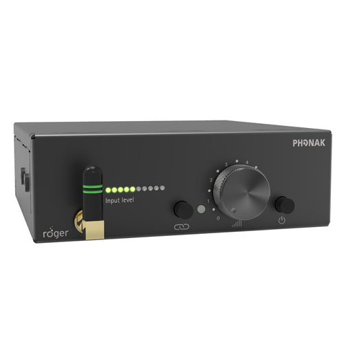 The Roger BaseStation stationary transmitter, delivers high quality speech signals to the wireless Roger Earpiece. Using Phonaks new digital standard at 2,4GHz and fully automatic frequency hopping technology ensures that the signal is transferred to the in-ear receiver in unrivalled sound quality.