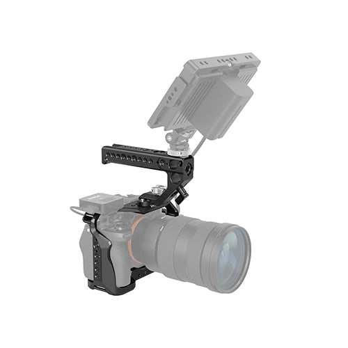 SmallRig Master Kit for Sony Alpha 7S III A7S III A7S3 3009 includes an aluminum full cage, an HDMI cable clamp, a thin NATO rail, and a quick-release NATO top handle. The camera cage features numerous 1/4"-20 and 3/8"-16 mounting threads, a NATO rail, a cold shoe mount, and ARRI-style mounts for accessories. The HDMI clamp attaches to the side of the cage using a 1/4"-20 screw and two anti-twist pins, which prevents the camera's HDMI cable from accidentally disconnecting. The NATO rail attaches to the top of the cage using two 1/4"-20 screws, and the top handle quickly mounts on the rail, providing a comfortable hand-holding point.