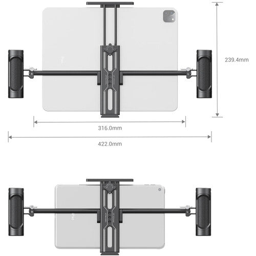 The mount features dual handgrips that are adjustable and removable for storage and different configurations. There are two shoe mounts and multiple 1/4"-20 threads around the mount to add accessories, and there are strap slots for an optional neck or hand strap. You can also mount your tablet on a fluid head, tripod, or other rig using a separately available Arca-type base using its 1/4"-20 tripod thread.
